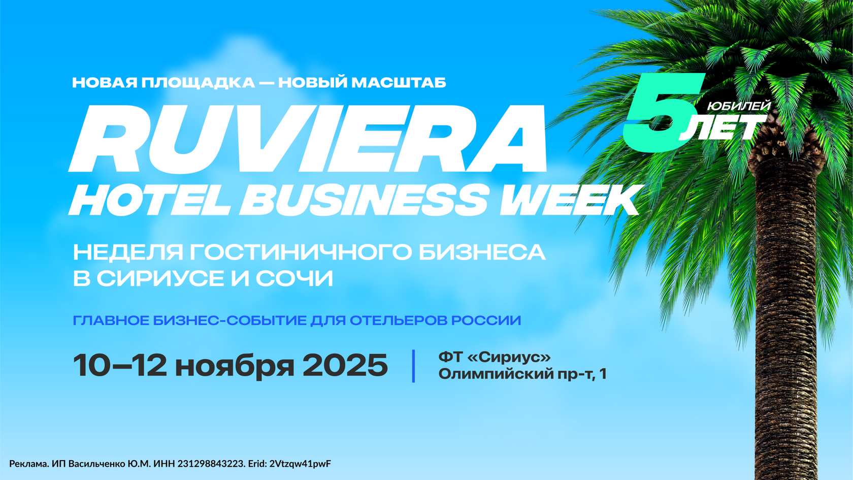 С 10 по 12 ноября 2025 года в 5-й раз состоится RUVIERA Hotel Business Week — ежегодная Неделя гостиничного бизнеса в Сириусе и Сочи. Место проведения: федеральная территория «Сириус», Олимпийский проспект, 1.